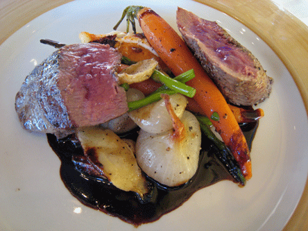 26 December 2010 (Bruch): Lamb is certainly a specialty at Zinc and is accented with seasonal touches. The grilled lamb loin Mignon, for example, is accompanied by a chorizo-sweet potato tart topped with a goat cheese bechamel, contrasting elements which bring out each others best qualities. A cleanly simple winter vegetable melange–baby asparagus, carrots, roasted onions–is perfectly prepared, so good even finicky children would love it. The lamb loin, prepared at medium rare, sits on a puddle of pomegranate demi glace, an ever-so-slightly tangy sauce with a lightly lacquered texture which couples so well with the lamb that they rhapsodize on your taste buds with a subtle medley of flavors you’ll remember long after your meal. The lamb has none of the gaminess for which lamb is often disdained.