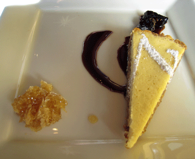 26 December 2010 (Brunch): Another fabulous dessert is the chevre cheesecake tart made with a honey granola crust branded with the letter “Z” (and probably not for Zorro). Rivulets of ruby port gastrique and fig preserves provide terrific contrasts to the sweet, creamy cheesecake. On the side of this dish is honeycomb, the pure essence of honey sweetness that’s better than any candy.