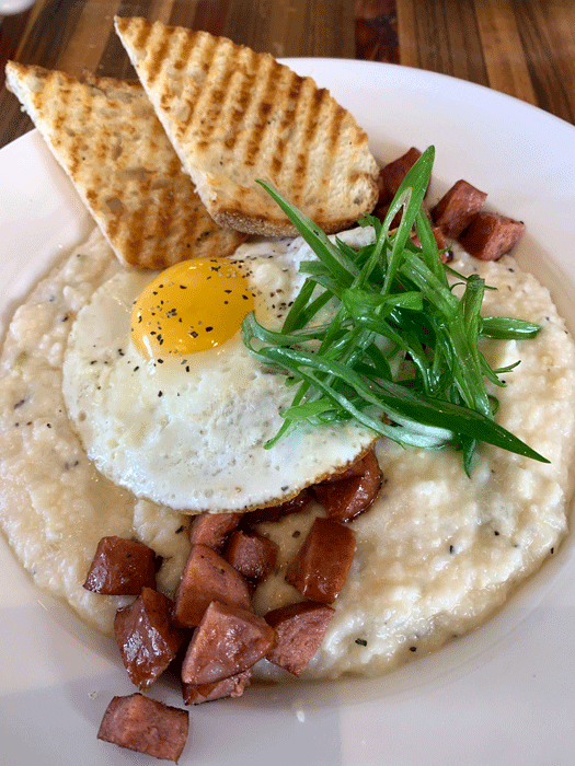 19 February 2019: Visit The Farmacy’s Facebook page and you’ll learn its motto is “Soothing the Savage Mind…With Food.” Never mind the savage mind. The Farmacy’s food even surmounts the most mundane of Mondays, especially when the special of the day is a transcendent green chile grits (green chile Cheddar cheese grits topped with chopped Andouille sausage, fried egg and scallions served with toast). Grits, an exemplar of true Southern comfort, are starting to catch on in New Mexico, their versatility showcased by talented chefs who consider them a blank canvas for other delicious ingredients…and is there anything in the world as delicious as green chile and Cheddar. The Andouille actually had more bite than the green chile, but together the pairing is sure to get your attention. So are the scallions which aren’t chopped into tiny ringlets, but served in a leafy entirety. The fried egg is a nice touch.