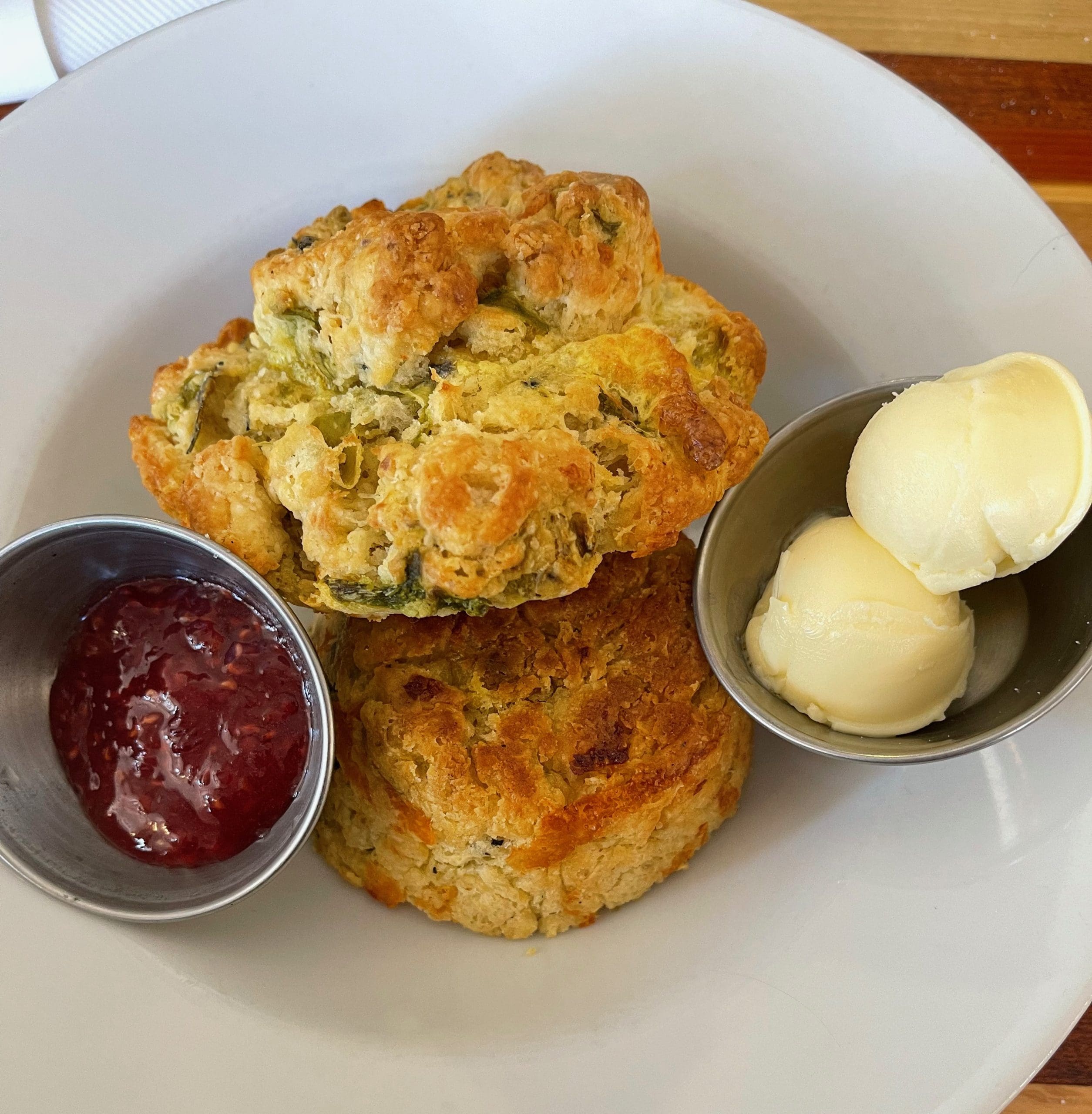16 April 2023: The Farmacy offers one of the most unique takes on a Southern favorite, biscuits and gravy you’ll find in the Duke City area. Named “Duke City Biscuit & Gravy” (green chile, Cheddar and egg baked inside a buttermilk biscuit with house made gravy). Having lived in the Deep South (Mississippi) for eight years, we contemplated how this would go over in Dixie. Would our Southern friends consider it sacrilege or would they embrace it like they do Country music? As with all foods, there’s no generalization. Some would love it, others would wave a white flag at the piquancy of the green chile. Though I didn’t order the Duke City Biscuit & Gravy, I frequently ask for a biscuit on the side of whatever I order. The green chile biscuit is terrific though it crumbles and falls apart easily, making it a challenge to spread butter and jam.