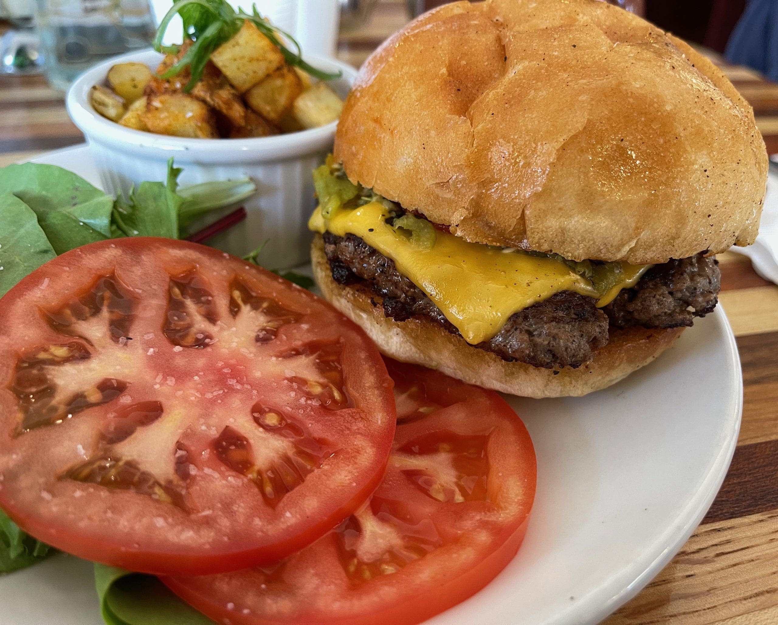 14 April 2023: Readers of Gil’s Thrilling know I frequently get hung up on words–their etymology, use, meaning, etc. So when I see that the Farmacy Burger (green chile, Cheddar cheese, diablo sauce on a toasted brioche bun) has two ingredients that ostensibly make this burger one with real heat, I fixate on the word “diablo.” Diablo is the Spanish word for “devil” is evil incarnate, the fallen angel. Obviously on the Farmacy Burger, diablo is a metaphor for piquancy and assertiveness. Just think of all the cowboy movies you’ve seen. The meanest horse that just won’t be broken is invariably named Diablo. Similarly, “fra diavolo,” meaning “brother devil” is the most piquant of all Italian dishes.