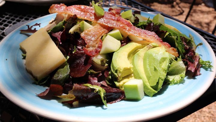 Unlike so many restaurants, the Teahouse doesn’t christen its salads with names as descriptive as those given racehorses. Instead, the ingredients for each salad are listed. My Kim’s choice was constructed from mixed greens, chicken, apple, bacon, Irish cheddar and avocado. With as many mixed greens as filled her plate, I would have preferred a breath-wrecking barrel of bleu cheese. Instead, a simple and lightly drizzled Balsamic vinegar dressing was the only thing between her and the various greens. The Dude and I enjoyed as much of the Irish Cheddar and bacon as we could coax out of her.