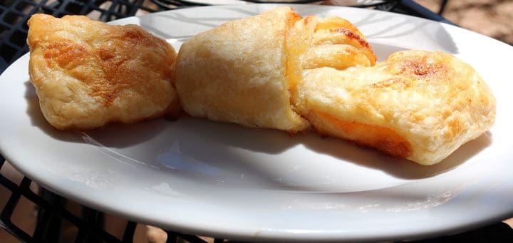 The menu has both a “Desserts” section and a section dedicated to “Pastries & Sides.” Unfortunately the actual menus have far fewer desserts than those listed on the Teahouse Web site. Not listed on the paper menu, for example, was the Santa Fe chocolate cake (dark chocolate cinnamon cake topped with dark chocolate and Chimayo red chile ganache). We settled for pastries instead. The almond twist is hardly a consolation prize. They’re not only light-as-air accompaniments to tea. Two (or five) of them will sate a hungry man, too.