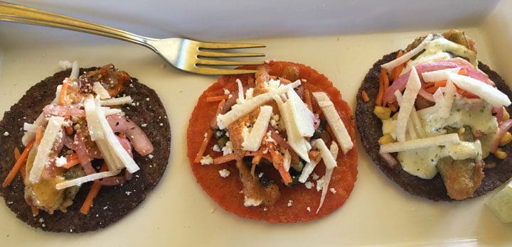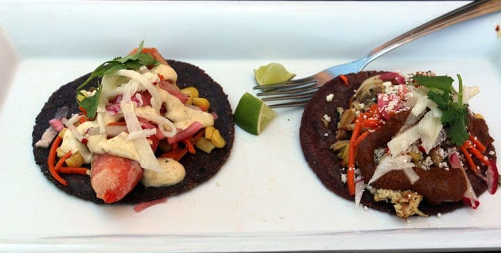 Consider it heretical if you will, but we found the vegetarian tacos–Squash Blossoms, Nopales and Chile Relleno–even tastier than the meat-based tacos. All tacos are served with pickled carrots, onions, jicama and radishes. Of the three vegetarian offerings, the chile relleno taco has the most piquancy and it’s the only vegetarian taco which also includes corn niblets. Squash blossoms, the edible flowers of the squash plant, make a wonderful taco filling. Even fried, they’re soft and delicate with a flavor reminiscent of squash itself. Noptalitos (prickly pear cactus pads cut into slivers) impart a tangy-sour flavor. The blue corn tortillas, made fresh daily, are not only delicious, but good for you.