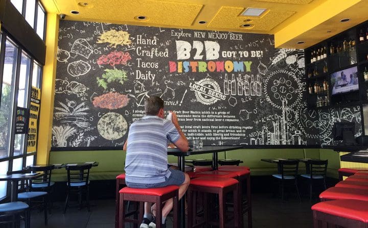 With tacos constructed from New Mexico sourced products–beef from Farm Fresh, pork products from Talus Wind Ranch, and even the blue, red and yellow corn (used to prepare hand-made tortillas) from Sunny State Products of San Jon–the B2B Tap Room has earned the right to use the tagline “New Mexico True.” New Mexico True holds true for its beers, too–54 taps, all from local breweries. Your heart may not swell with state pride when you set foot in the 1,600-foot restaurant, but you should take comfort that the menu promises tacos which are “localicious, tacolicious and delicious.”