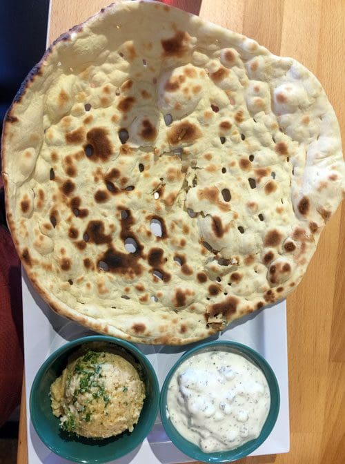 27 June 2017: Our sides ranged from very good (the mirza ghasemi, a grilled eggplant and tomato dip with plenty of garlic) to good (mast o khiar, a cucumber and yogurt dip similar to Greek tzadziki) to unremarkable (a rather dry hummus). The freshly baked naan is much larger than its Indian restaurant counterpart and quite a bit crispier. Roughly the size of a medium pizza, it goes well with any of the sides, but is just too crispy to use “sandwich style” with the kabobs.