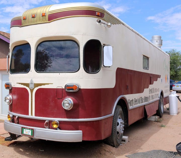 Where others saw an unused, unloved, unwashed motorized mess, Corrales Chef Jon Young and his radiant bride Melissa, saw their opportunity to become a part of the food truck revolution sweeping across the fruited plain. In 2014, they purchased the vintage bus and began the painstaking process of transforming it into a mobile food kitchen where Jon could ply his passion for creative fine dining. The renovation process required the patience of Job. Obsolete parts had to be retooled by hand. In fact, the entire refurbishment process was arduous and manual. With Jon and Melissa working assiduously, the ugly duckling slowly began blossoming into a graceful swan. Timeworn seats gave way to swanky booths more comfortable and spacious than first class airline seats. A small, but fully functional kitchen was installed at the back of the bus. Kitchen utensils such as a spatula and spoon were converted into door handles.