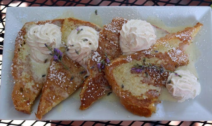 16 July 2017: French toast are described on the menu as “sourdough bread topped with sweetened mascarpone cheese topped with your choice of fruit and powdered sugar” with fruit choices being bananas, peaches and strawberries. When our savvy server suggested lavender, we jumped at the opportunity. Syrup need not apply for a place on these four golden slices of eggy bread flecked with lavender. Sweetened mascarpone made them sweet enough with the lavender often making its presence felt in tempering any residual sweetness. In the spectrum of sweet that runs from mild to cloying, these French toast were…just right.