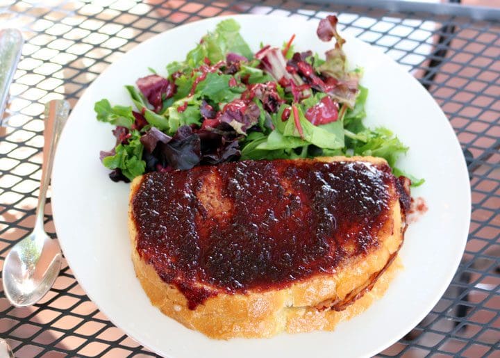 16 July 2017: Similar to French toast, the bistro’s Monte Cristo is lightly dipped in egg batter then grilled. This beauteous sandwich is constructed on sourdough bread and filled with ham and Gruyere cheese. It’s topped with a cherry-brandy reduction. More commonly, a Monte Cristo is topped with a small amount of powdered sugar and traditionally served with a ramekin of raspberry or strawberry jam you can apply yourself. There’s nothing common about this sandwich. The cherry-brandy reduction is a superb complement to the savory elements of the sandwich, working with them instead of overpowering them with sweet notes. Both the rich, nutty Gruyere and the salty ham worked well, too.