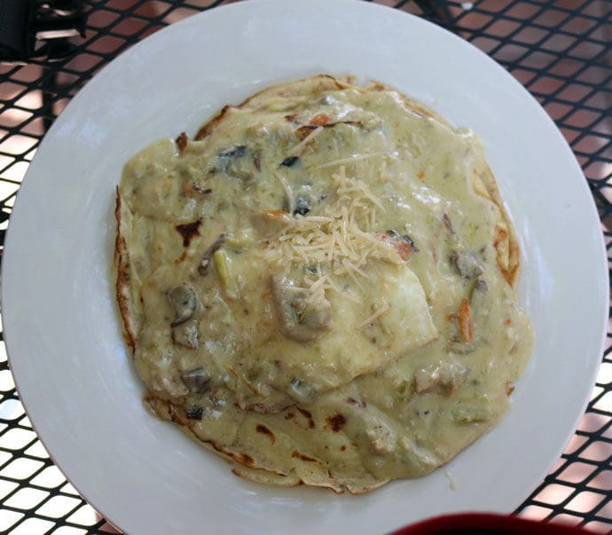 16 July 2017: It’s a rarity in Albuquerque to find a brunch menu without any number of dishes showcasing the Land of Enchantment’s addictive red or green chile. On Fresh’s brunch menu there are only two. One is eggs Benedict served with carne adovada. The other is a dish created by the inventive chef. It’s called a Frenchilada and it’s a sort of New Mexico meets France featuring layers of crepes filled with chicken breast, green chile, mushrooms and roasted garlic cream sauce with an egg on top. This is a magnificent dish! Chef Young doesn’t shy away from piquant chile and he doesn’t use it sparingly. The foil to the chile’s heat is the mushroom’s earthiness. You’ll want to lick your plate to ensure you don’t leave behind any of the roasted garlic cream sauce.