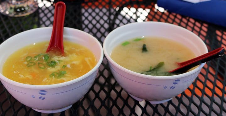 Shortly after ordering our chicken satay appetizer, our effusive server ferried over our soups of choice. For my Kim, it was a bowl of egg drop soup served hot to the touch. For me, only a bowl of miso soup should ever precede a meal of sushi. As usual, Kim’s choice was better (not that the miso soup wasn’t good). Egg drop soup Egg is made by “dropping” the whisked eggs very slowly into to boiling stock and stirring rapidly in one direction. The result is thin, wispy strands of silken egg. Rare (at least in Albuquerque) is the pronounced yellowish hue of this enchanting elixir. The miso soup, on the other hand, is on par with miso soup served throughout the city.