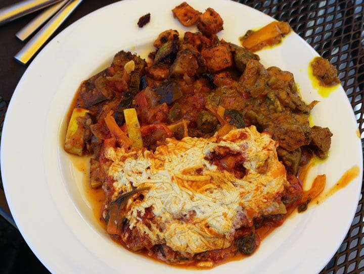 In three trips to the buffet, he sampled virtually everything available. His grumbling and snarling were quickly replaced by exclamations of “wow, this is good” with virtually every new item. The three of us probably enjoyed the curried lentil and sweet potato stew most. Not only does the curry have its characteristic pungency, it’s got a pleasant bite that blends very well with the sweet potatoes. We also enjoyed the ratatouille which looks nothing like the dish served in the animated movie of that name. The vegetarian lasagna drew much appreciation as did the stir-fried vegetables. From among the more “salady” items, the sauerkraut (made with purple cabbage) stood out as did the pepitas with which we topped our greens.