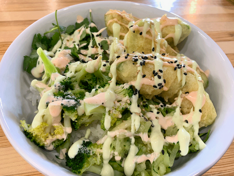 Among those eight is the Paleo, perhaps the only bibimbap offering you’ll ever see without rice. Other more conventional bibimbap options are made with white rice, brown rice and fried rice. My inaugural bibimbap bowl was basically selected by closing my eyes and pointing. It was that difficult to decide which one to order. My random bibimbap bowl was fittingly called “Green Bowl” (white rice, tempura avocado, broccoli, zucchini, cilantro, creamy avocado and Sriracha lime crema. As with all composites, there are elements of this dish we enjoyed more than others. Our favorite component was the tempura avocado, four buttery avocado slices sheathed in a crispy tempura batter. Also noteworthy were both sauces–the creamy avocado and the fiery, tangy Sriracha lime crema, so good we asked for extra sauce.