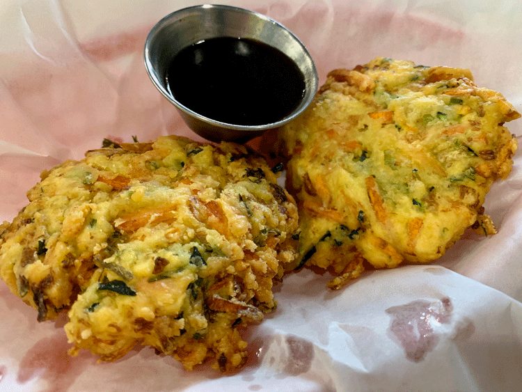 16 November 2019: Among our very favorite items at Korean restaurants are scallion pancakes. Whether prepared at Korean restaurants such as Asian Pear or at Chinese restaurants such as Budai Gourmet Chinese, these ubiquitous appetizers never fail to make us happy. There are no scallion pancakes at Soo Bak. The closest approximation are veggie fritters, each about the size of a burger patty. Replete with vegetables and served with soy sauce, they may never replace scallion pancakes in our hearts, but they’ll more than do in a pinch.