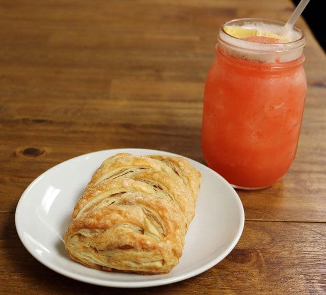 1 September 2017: Whether you’ve been hiking at Bandelier or just parched from the salubrious mountain air, the strawberry lemonadewill slake your thirst and delight your taste buds. It’s served in a Mason jar with plenty of ice to keep it cold and it’s not too sweet or too tart (Goldilocks would love it). Because it was served at the same time as the lemonade, I made quick work of the apple strudel. My well-intentioned willpower to sample only one bite and save the remainder for dessert went out the window. This strudel is reason enough to consider moving to White Rock. It’s light, flaky and fabulous–the optimum ratio of apples to crust!