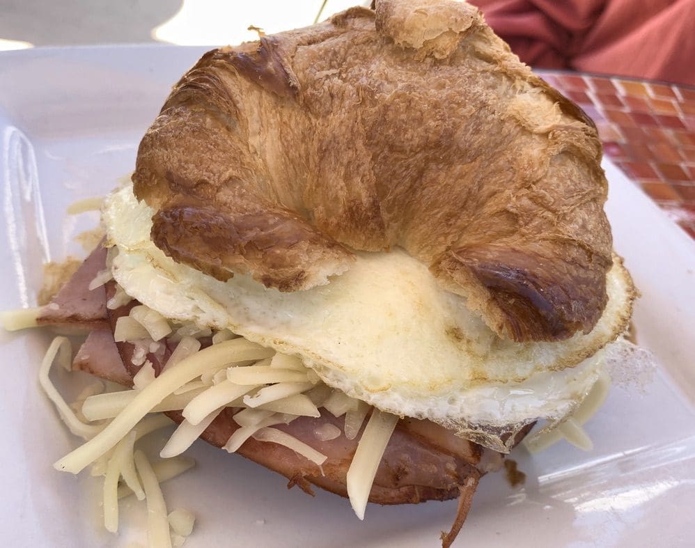 21 June 2020: There seems to be a template for the breakfast sandwich and it subscribes to the one made famous at a certain chain restaurant which shall remain mc-nameless. More than any restaurant in memory, Pig + Fig lets you enjoy your breakfast sandwich your way. The sandwich is filled with fresh eggs made the way you want them (scrambled or fried easy, medium or hard), your choice of cheese (Cheddar or Swiss) and the meat or vegetables you want (bacon, ham, sausage, summer or winter vegetables). You can also have it with your choice of bread: biscuit, white, whole wheat, sourdough, ciabatta, butter croissant, chocolate croissant, gluten-free toast, almond croissant, scone or muffin. Now those are options! Kim’s was constructed on a croissant stuffed with Swiss cheese, bacon and ham. Who wouldn’t want to wake up to a breakfast sandwich this good?