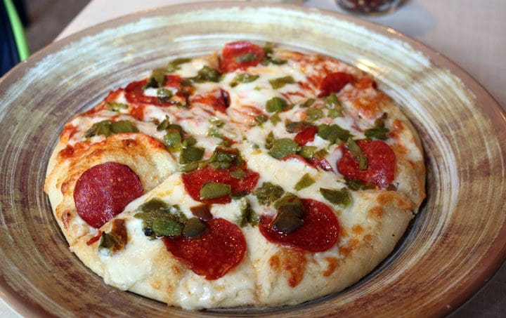 3 December 2017: Nine pizzas grace the Groundstone menu. Available in ten- and eighteen-inch sizes, they’re not as waifishly thin as today’s fashionable pizzas nor are they thick, casserole-like slabs. If the Brooklyn (pepperoni, roasted garlic, mozzarella, fontina, garlic infused olive oil) is any indication, they’re more generously topped than the penurious pizzas on which it’s a challenge to find some of the named ingredients. That generosity applies as well to the cheese which drapes over the crust like a molten blanket. No matter which of the pizzas you order, it can be improved with green chile (which goes well with everything).