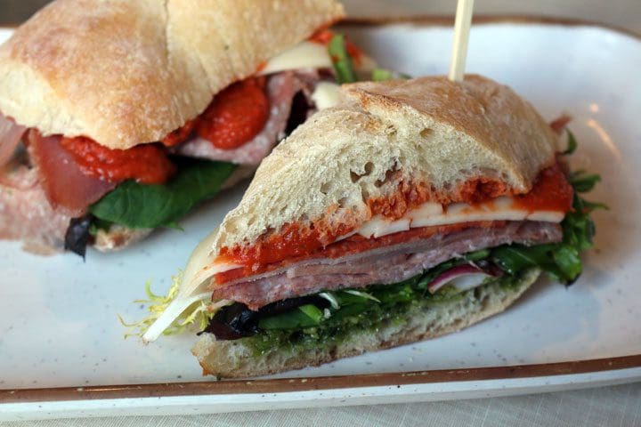 21 February 2018: There’s only one problem with Groundstone’s specialty sandwich menu. The first time you peruse it, you’ll want to order each of the six sumptuous sandwiches. The second time you visit, you probably will order the sandwich with which you fell in love your previous visit. That’s become Kim’s dilemma. After enjoying the Groundfather (Genoa salami, pepperoni, prosciutto ham, mixed greens, pesto, marinara sauce and provolone cheese served on a Fano rustic ciabatta roll), she can’t wait to have it again. If you didn’t already know how special Fano bread is, this sandwich will quickly show you. It’s a perfect canvas with the perfect consistency for this sandwich–crusty on the outside and tender on the inside. The combination of pesto and marinara sauce is a pleasant surprise; they don’t always work together well. Then, of course, there are the meats and cheeses, an array of Italian delights.