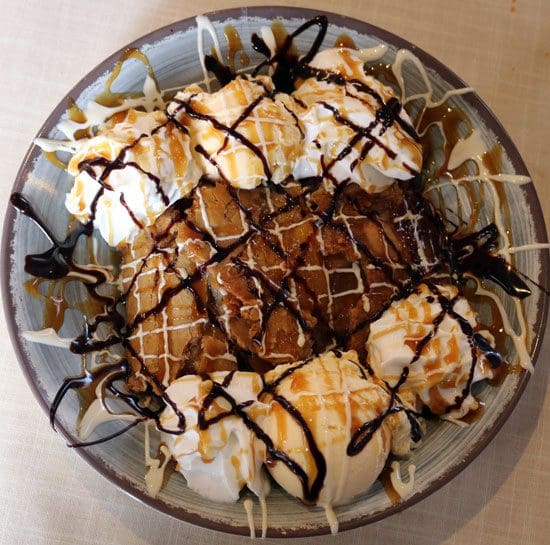 21 February 2018: In describing the importance of desserts, movie writer and creator Anne McManus, declared “It’s the finale. It’s the last impression. A bad dessert can ruin the meal.” Don’t expect to find any bad desserts at Groundstone. There are six decadent desserts on the menu, all tempting. Groundstone’s Cobbler (your choice of cherry, apple, or peach, with vanilla ice cream) is work of art on a plate. Flanking our peach cobbler are vanilla ice cream and whipped cream with chocolate and caramel drizzle. The cobbler itself showcases a sweetened biscuit topping baked until the peaches are tender and the topping is golden. The peaches are juicy and fresh. It’s elevated cobbler at its finest.