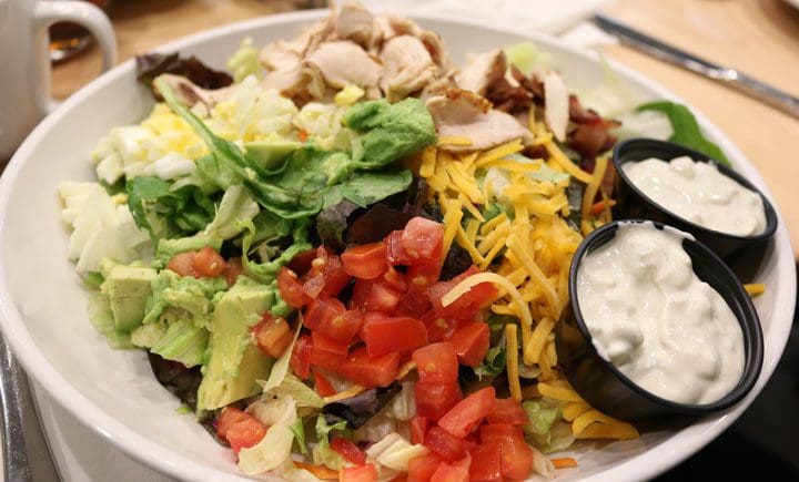 While the rest of us enjoyed our cavalcade of calories (washed down with Diet Pepsi), my Kim had a more sensible Cobb salad, albeit a behemoth bounty of lettuce, bacon, shredded Cheddar cheese, chopped tomatoes, grilled chicken, sliced avocados, hard-boiled eggs, croutons and Maytag blue cheese dressing. Unlike her fetid fromage fanatic of a husband who enjoys a modicum of vegetables with my blue cheese dressing, she applies it judiciously. Maytag blue cheese is one of the premier blue cheeses produced in America. Its melt-in-your-mouth tangy, semi-sharp deliciousness is memorable.