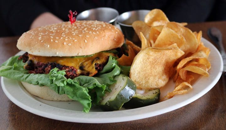 4 January 2018: It hasn’t been for lack of trying that I’ve never enjoyed a vegetarian burger. Most range from barely edible to downright awful. The Acre’s cheeseburger propels all the others into my repository of bad memories. The “beef” substitute is a beet-black bean combination which might not make you forget your favorite 80-percent lean ground chuck to 20-percent fat content ratio, but it shouldn’t. It’s very good on its own with a moistness and flavor yes, even carnivores will enjoy. The burger also includes Cheddar, avocado, lettuce, tomato and onion with mustard and ketchup on the side. It’s served with potato chips.