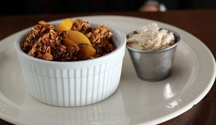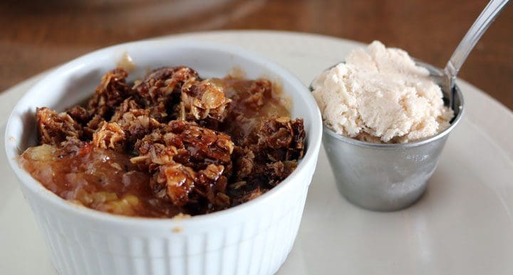 4 January 2018: The Acre’s five desserts (as well as cookies and milk and an ice cream of the day) alone might convert carnivores to a life of vegetarianism…or at least to increased open-mindedness. Elaine’s choice was the Fresh peach crumble (brown sugar, vanilla). Though fresh peaches were a bit out of season, at least they weren’t canned…and who doesn’t love a good crumble. For someone who espouses green chile as an ingredient which goes well with everything including desserts, my only logical choice was the green chile apple crisp showcasing Hatch green chile. It was a bit too incendiary for Elaine’s tastes, but perfect for this fire-eater. Besides, the snickerdoodle ice cream was there to quell any burn.