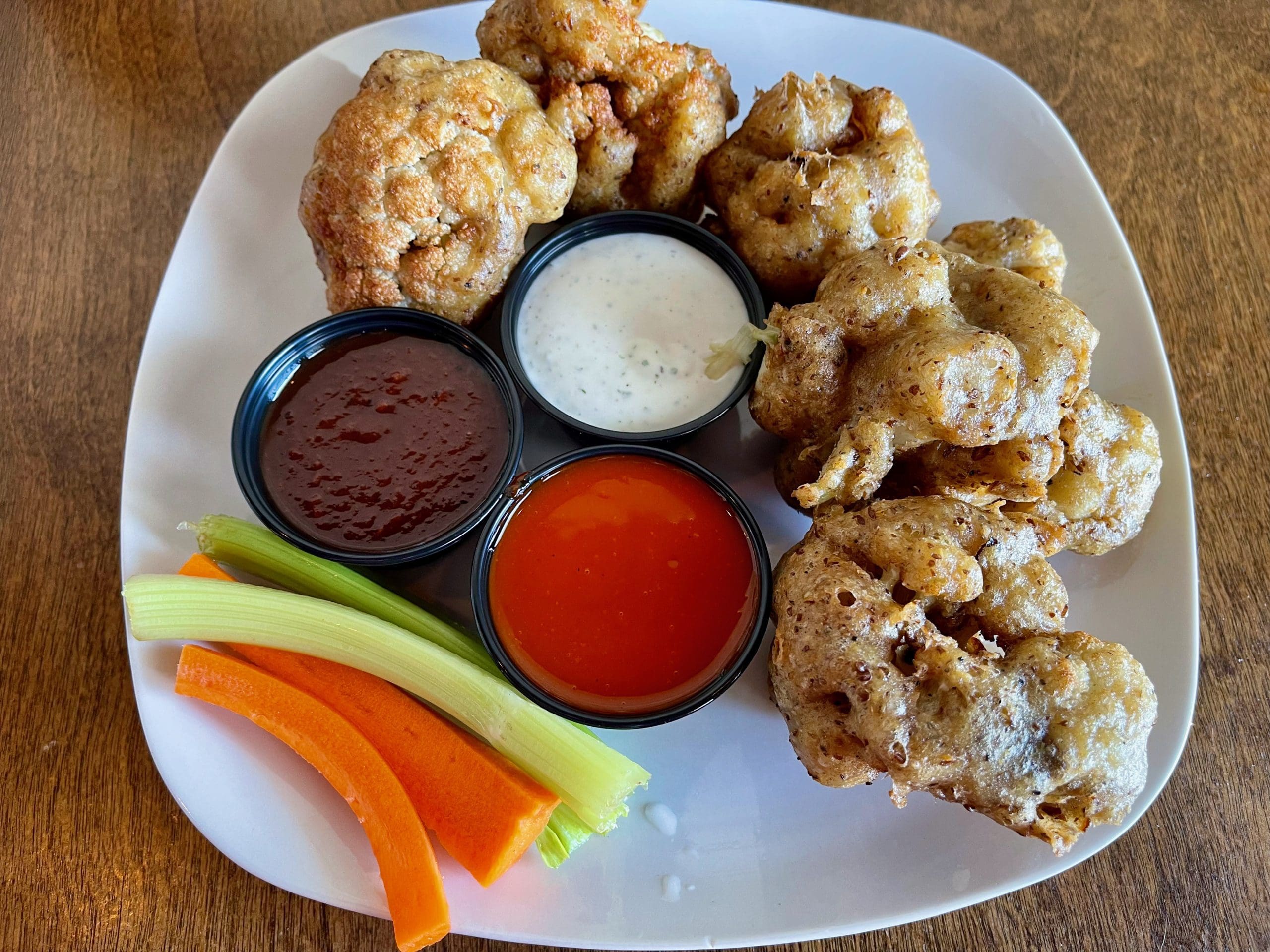 22 July 2022: Although my Kim may not have liked the comfort dogs, she did love the cauliflower wings (fried breaded cauliflower, celery, carrots, vegan ranch, choice of classic red hot buffalo or barbecue sauce). Unlike alligator, frog legs and rattlesnake, the cauliflower wings did not taste like chicken. They tasted like five glorious florets of lightly breaded and perfectly fried cauliflower. The light batter easily gives way to a delightful crunch with a good sharp bite and a sweet-savory flavor with just ever so slight better aftertones. Both sauces are quite good. The barbecue sauce has smoky notes while the red hot buffalo had pronounced tanginess courtesy of vinegar chased by a pleasant piquancy resultant from the infusion of hot peppers. On Superbowl Sunday when wings are consumed by the millions, vegetarians need not ever feel left out.