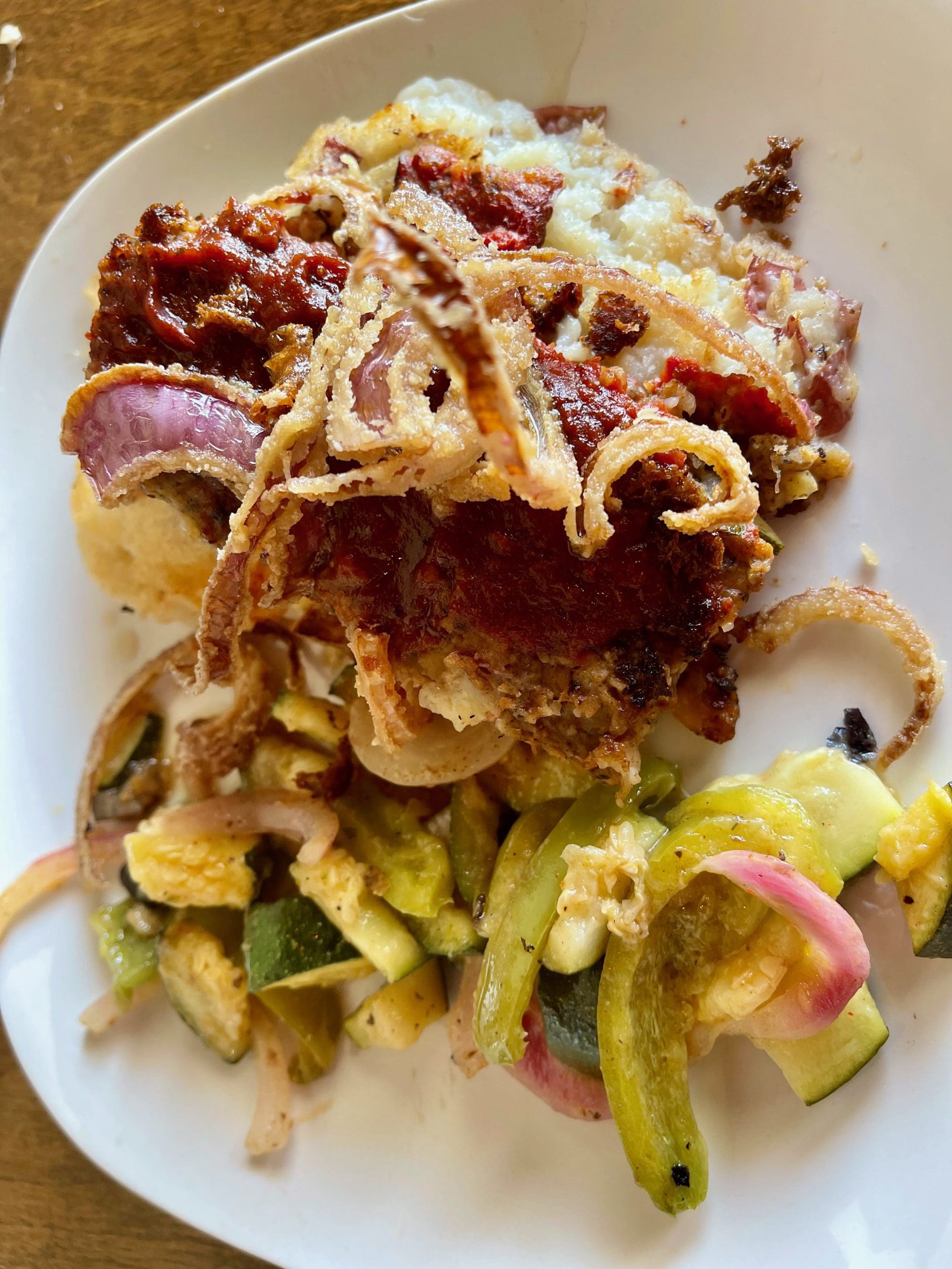 22 July 2022: When Food Network glitterati Guy Fieri visited The Acre, he was “blown away” by the umami and flavor of the meat(less) loaf (signature chickpea portabello loaf, house made bbq sauce, onion strings, mashed potatoes, sauteed seasonal vegetables “It’s really good,” Fieri declared. I can second the mayor of Flavortown’s opinion. It’s really good! Again, it doesn’t exactly taste like a traditional meatloaf, but it has the same properties that make meatloaf a comfort food favorite. It also doesn’t have any of the brick-like density of some meatloaf and none of the dryness of meatloaf that’s been in the oven too long. This is a delicious and moist slab of palate-pleasing meatloaf you don’t have to be vegetarian to enjoy. Only a hearty dredge of gravy was missing; surely there’s a vegetarian gravy somewhere out there.