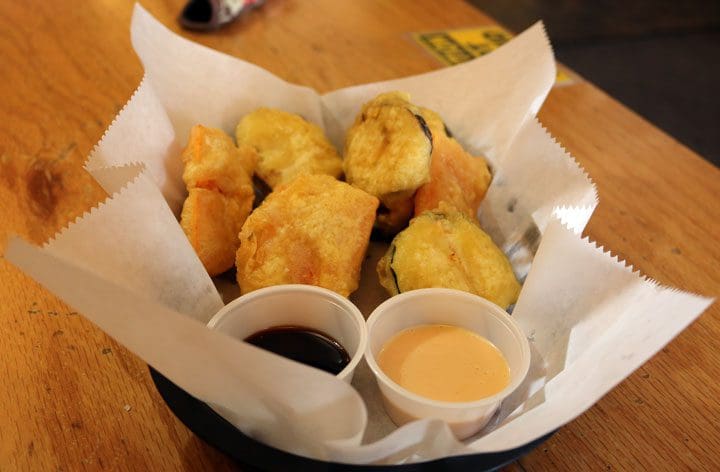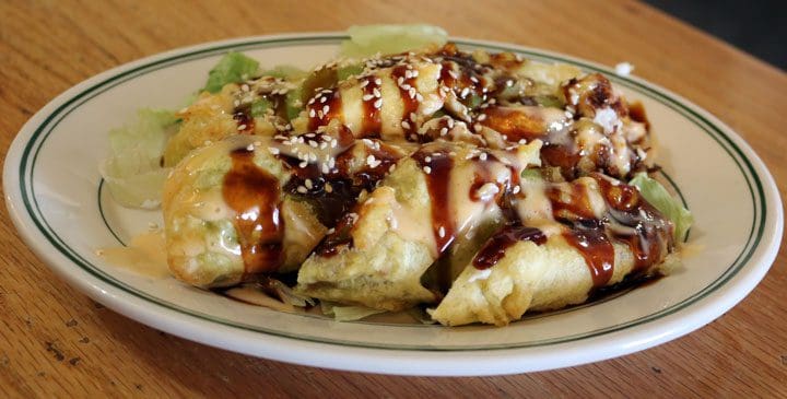 More satisfying is a New Mexico meets China starter called Chili Puff, two pieces of green chile lightly coated in tempura batter and stuffed with cream cheese and crab meat with spicy mayo and eel sauce on top. Fire-eaters might want the green chile just a tad more piquant and the spicy mayo doesn’t add additional heat to counterbalance the sweetness of the eel sauce, the slightly sour, slightly salty cream cheese and the faintly fishy, briny flavor of the crab meat. Still, it’s a very pleasant appetizer. Cut it into inch-long slices and you could call it green chile sushi sans the vinegared rice.