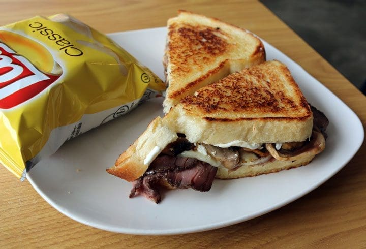 In a recent comment posted by Sarita, a good friend of this blog (and someone with whom I hope to someday have the honor of breaking bread…or tortillas, pita, lavosh, etc), she highly recommended several items on the menu, lavishly praising the roast beef (not thinly sliced…very tender). She recommended the Toasted RB (roast beef, Cheddar, green chile and mayo on a grilled roll). Not in a green chile mood, my Kim opted instead for the cleverly named Adobe Brick, a brick-sized sandwich she would later praise as “one of the best sandwiches I’ve had in Albuquerque.” So what’s in an Adobe Brick? Picture thickly sliced, tender roast beef; sour cream, Provolone, grilled mushrooms and red onions on grilled sourdough. This is truly a sandwich for which all ingredients work in multi-part harmony. From the umami of the sour cream and mushrooms to the mellow mildness of the Provolone, this sandwich will enrapt your taste buds. Sourdough is the perfect canvas for a sandwich that needs absolutely nothing else.