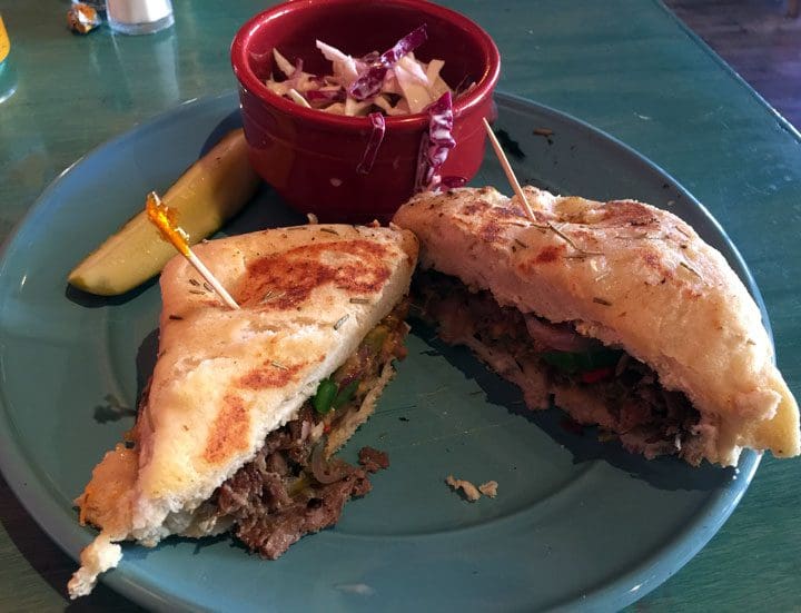 28 March 2018: Java Joe’s sandwich menu features both cold and hot sandwiches, both served with a side of pasta salad, coleslaw, or sweet potato chips. Cold sandwiches are served on multigrain, sourdough, marbled rye or baguette while the canvas upon which hot sandwiches are prepared is a baguette. No ordinary baguette is this. Texturally it reminds me of a buttery, soft focaccia with herbaceous notes. The Southwest Philly (red onions, bell peppers, green chile & provolone cheese piled on grilled Philly steak) is rather unconventional for a Philly, but it’s a good one. My sole complaint is that the green chile was so anemic I had to look for it (probably an anomaly). The coleslaw might best be categorized as “could have been” as in with a little more salad cream or maybe chopped jalapeños, it might have been better.