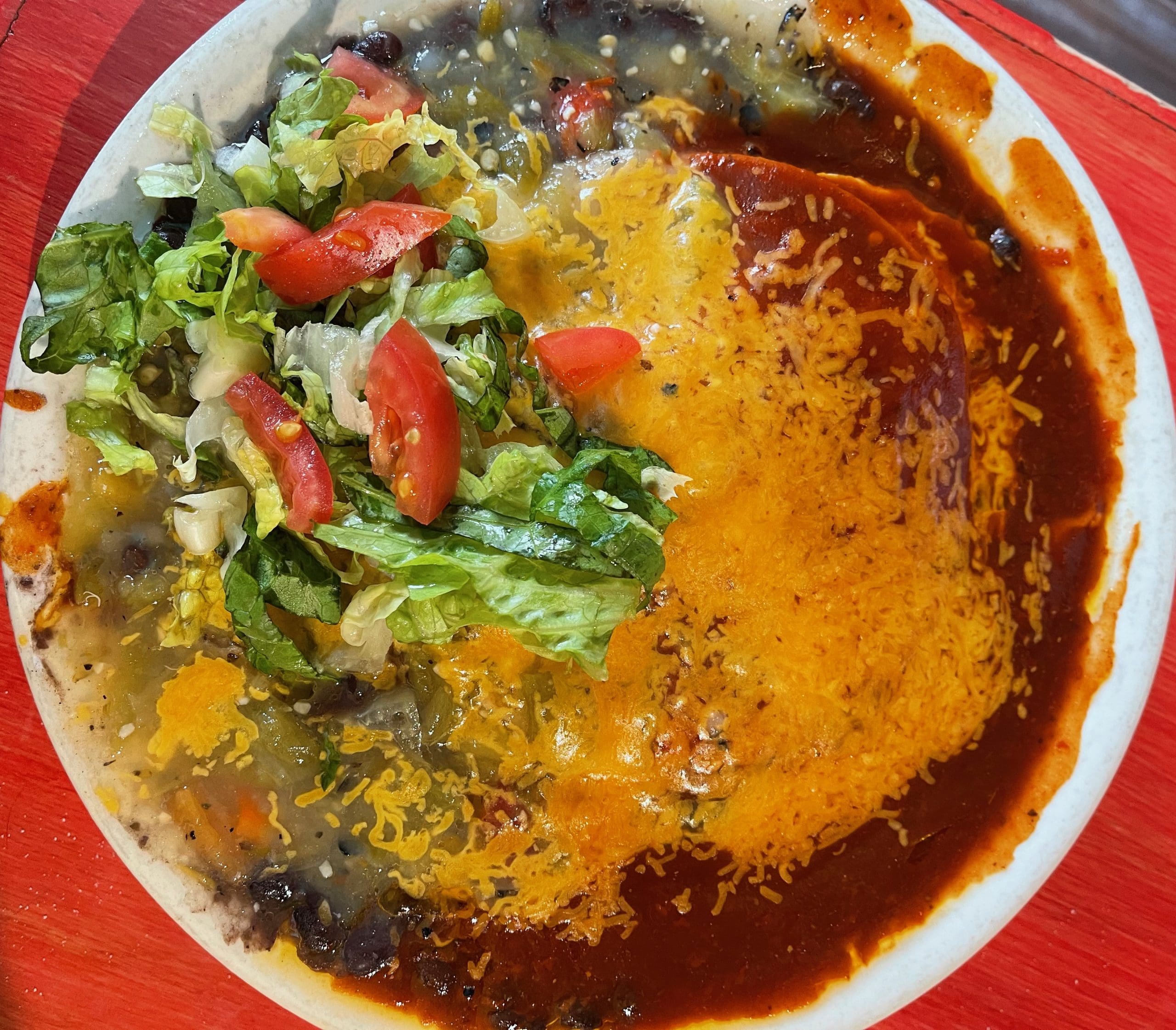 18 April 2023: Breakfast enchiladas, once a relative rarity in Albuquerque, are becoming more prevalent, a terrific alternative to the ubiquitous New Mexican breakfast burritos and huevos rancheros. Java Joe’s breakfast enchiladas features three corn tortillas layered with Cheddar, black beans and eggs smothered in red or (and) green chile. Both the red and green are terrific with the piquancy and flavor aficionados crave. After more than three decades of occasionally enjoying New Mexican cuisine laced with black beans, it still surprises me to see them on enchiladas, huevos rancheros or burritos. Pinto beans, after all, are the official New Mexican state vegetable (along with our sacrosanct red and green chile). No matter. The chile is the centerpiece of this delicious breakfast dish.