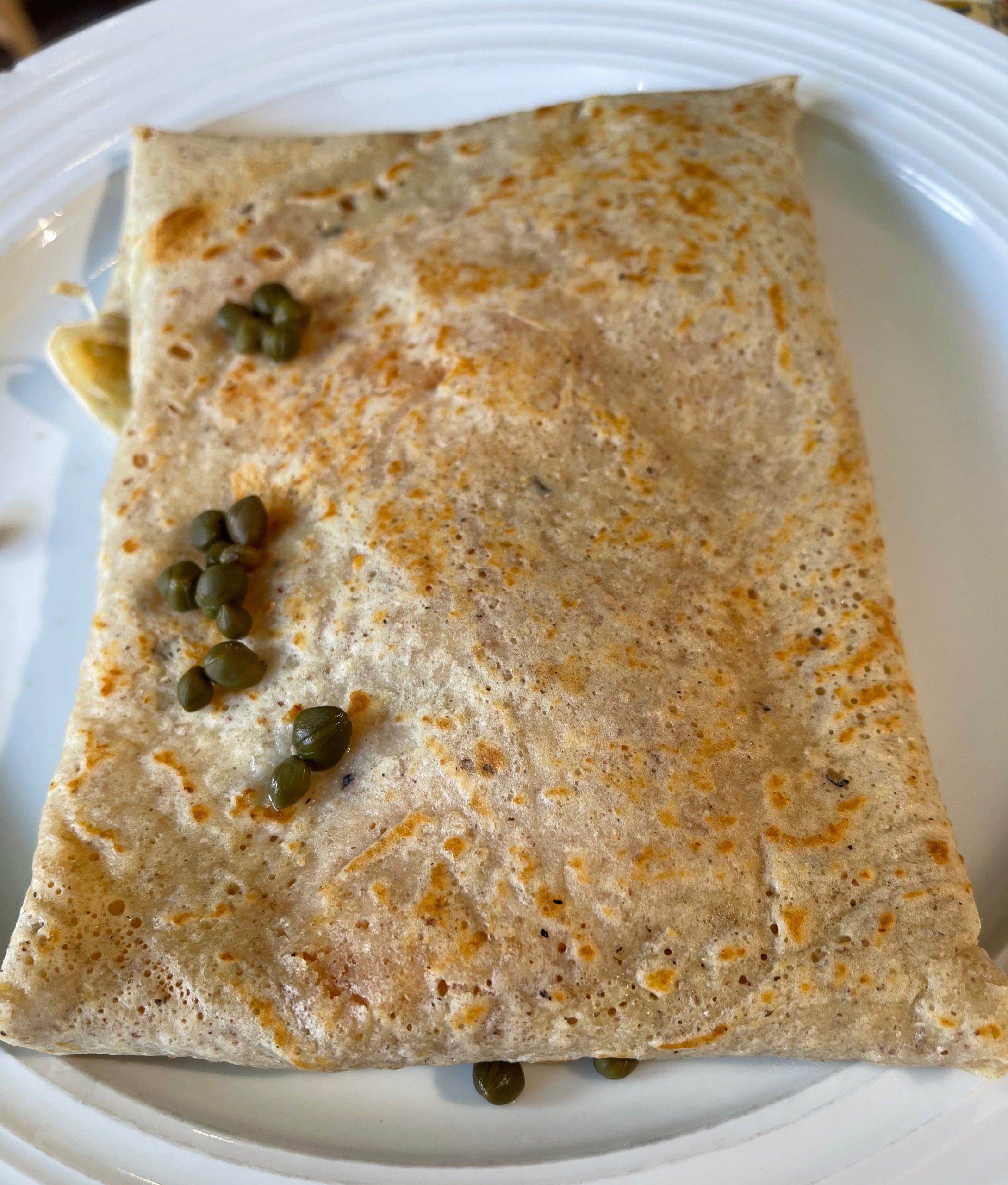 The lox crepe is indeed a treat here. Not only is it a great idea, they put a very satisfying amount of ingredients in it. I am always disappointed by the pitiful number of capers that typically accompany a lox/bagel combo. When I cut into my crepe, much to my surprise and delight, capers came cascading out like a waterfall! In addition, the slab of salmon was quite large and it seemed for a moment that there was an entire brick of cream cheese in there. Part of the illusion is that the ingredients are all piled in the middle, the crepe folded on all sides much like you would wrap a square package. Which actually brings up a question. When I first discovered crepes, long ago in a galaxy far, far away, they were rolled like little burritos. I’ve had two crepes in as many weeks and they were not presented that way. It all tastes the same, and I have left both restaurants with a huge grin on my face after consuming said crepes, but I just wonder why chefs stopped doing the role type preparation. Easier to eat; perhaps more difficult to prepare? I think I’ll have to return soon if for no other reason than to ask that question. 😁