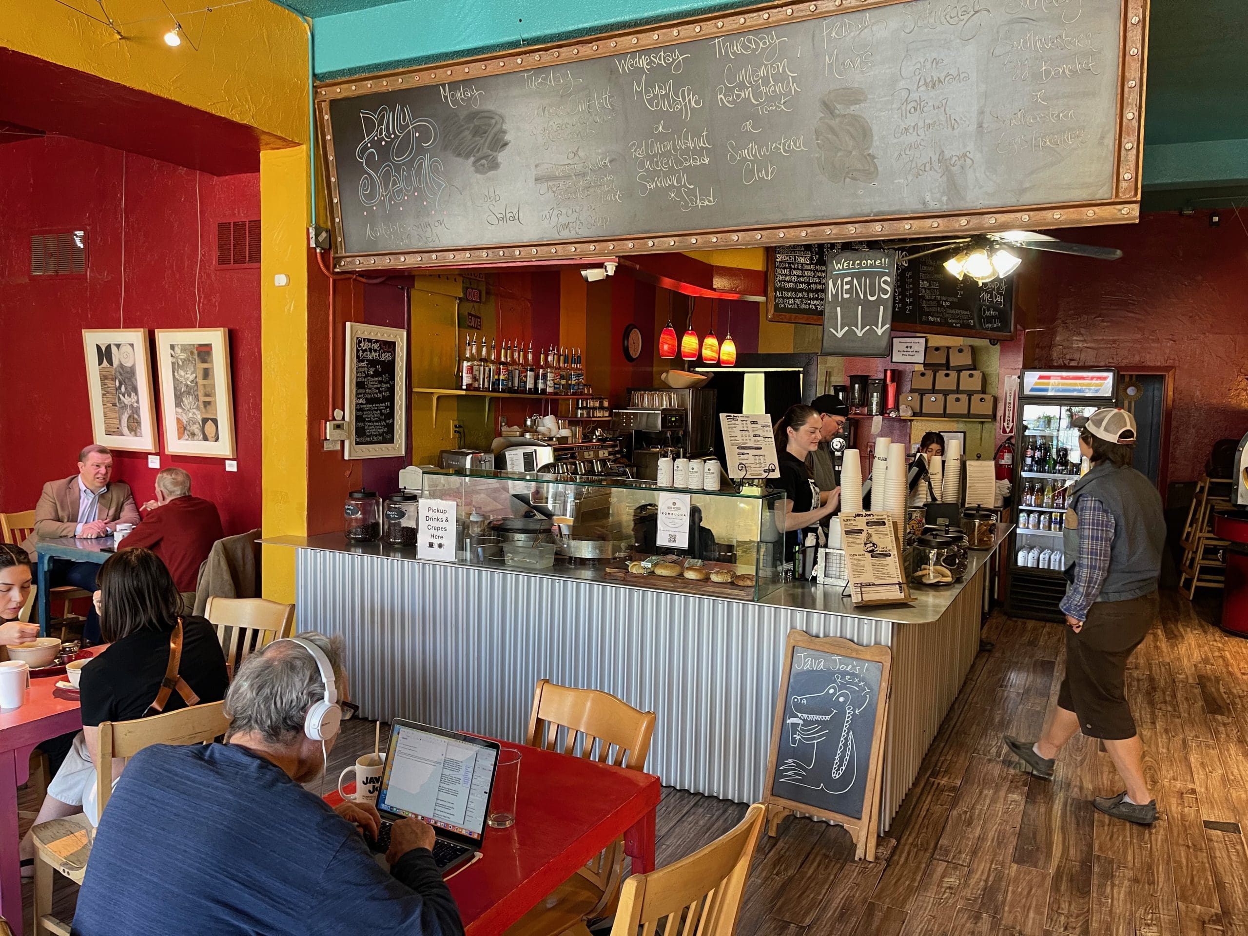Step into Java Joe’s and there are no vestiges of Tuco’s headquarters. Instead of Tuco’s thuggish henchmen, you’ll run into hipsters and hippies, blue collars and white colors, and the type of characters who put the quirky in Albuquerque. Scrawled on a black slate board above the counter where you place your order is a menu listing every daily special. Plastic menus on the counter list everything else. Walls are festooned with eclectic art, much of it for sale. Handmade lotions and soap on a table hugging a wall are also available for purchase.