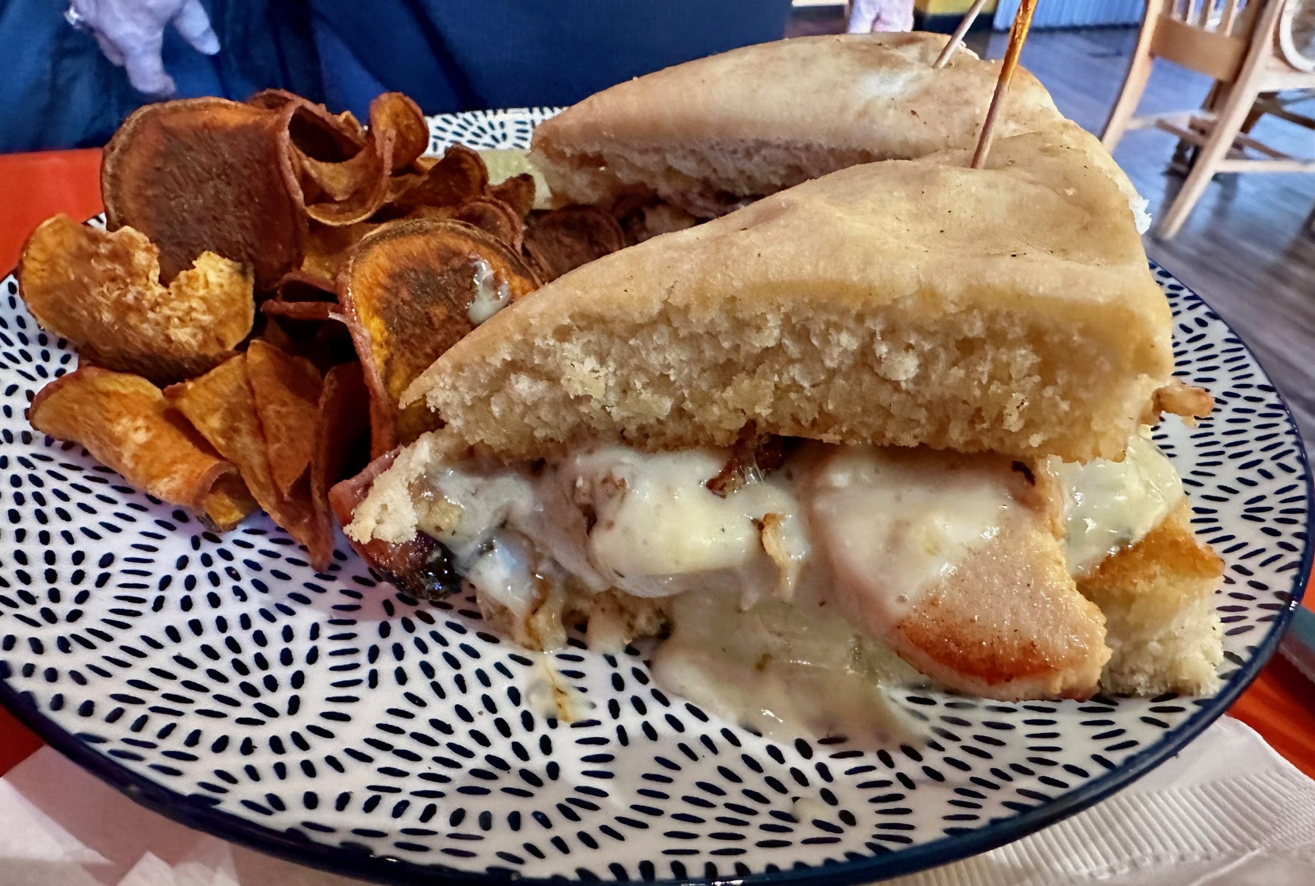 That is until our November, 2023 visit to Java Joe’s. It took a rather unique interpretation of the sandwich to tantalize my taste buds. Java Joe’s version of the chicken cordon bleu sandwich is made with a chicken breast, honey ham, grilled pineapple, Monterey Jack and bleu cheese on soft focaccia. What really takes this sandwich to the top is the copious portion of bleu cheese and the wonderful contrast of flavors between the sharp, pungent fromage and the sweet pineapple. It’s a combination that really works well.