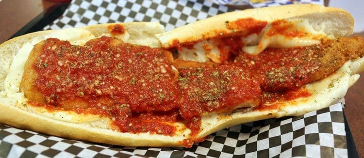 Yes, Roberto, chicken Parmesan sandwiches. My dear friend Becky Mercuri reminded me that chicken Parmesan became popular when veal got so expensive then faded from popularity about 30 years ago because of how veal is produced. Both veal and chicken Parmesan are still offered by many old school red sauce Italian restaurants. My preference, of course, is for veal Parmesan, but Philly Steaks doesn’t offer it.