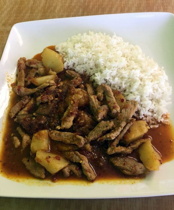 20 April 2018: 528’s inventory of Myanmar-style dishes is fairly limited and not all of them are prefaced with the term “Myanmar-style” so it pays to ask. The quaintly named Ka-Chin Style Spicy Chicken may trigger recollections of the sound of a mechanical cash register when an amount is rung up popularized in Wayne’s World, but Ka-Chin is actually the northernmost state of Myanmar, a region inhabited by a confederation of ethnic groups. If all their cuisine is as delicious as 528’s Ka Chin-style spicy chicken, I may just have to move there. My friend Bill described this dish best–“intensely flavored.” In this case “spicy” doesn’t mean “piquant” though there’s a bit of heat in this dish. There are also savory, tart, pungent and sweet notes with the tart-pungent combination taking it to the nth degree. This beauteous dish is made with tender, thin slices of chicken breast, red pepper, jalapeño, Thai basil, Vietnamese coriander and tamarind and it’s served with rice which takes some of the oomph out of its flavor bombardment qualities.
