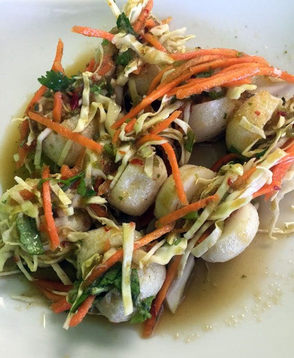 13 April 2018: Just as unique is the Myanmar style spicy vegetables stuffed fish cake appetizer, another theretofore new to me surprise. I had absolutely no idea what to expect. Surprises abounded, starting from the piquant-citrus fragrance wafting from the dish, a bouquet very reminiscent of my favorite papaya salad from An Hy Quan. The fish cakes were the color of scallops and were split in half butterfly style. They weren’t so much stuffed as “vegetables” (mostly julienne carrots, cabbage and cilantro) inserted into the butterflied center of each fish cake and tossed with a piquant citrus sauce. Texturally, the fish cakes somewhere between marshmallow soft and chewy. Altogether, this is a terrific dish, one which must be experienced to be appreciated.