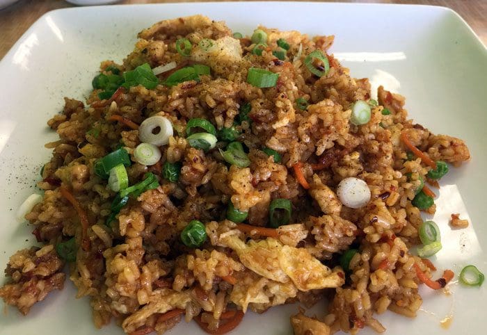 20 April 2018: Save for the Chinese sausage fried rice at Ming Dynasty, I long ago gave up on finding great fried rice in the Duke City area. Fortunately my friend Bill Resnik doesn’t give up as easily. With Marco Polo-like passion, he persists in his search for a fabulous fried rice. He found two at 528: the Indian-style fried rice and the spicy fried rice. The latter is in rarefied air, right up there with Ming Dynasty’s transformative Chinese sausage fried rice. It’s got most of the same components (rice, egg, onion, garlic, tomato, bok-choy, carrot, green peas, pepper) of other fried rice dishes we’ve had, but unlike others, it’s not clumpy, gummy and starchy. Every grain is impregnated with stir-fried deliciousness, every ingredient in perfect proportion to the others. You’ll want to eat a mountain of this stuff!