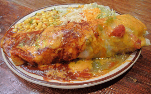 28 July 2013: Although Papa Felipe’s isn’t open for breakfast, it does offer one of the very best–and certainly one of the largest–breakfast burritos in Albuquerque. The aptly named Big Papa Breakfast Burrito is constructed from a giant flour tortilla engorged with three scrambled eggs, Papa’s potatoes, carne adovada (marinated in your choice of red or green chile) and Cheddar Jack cheese topped with your choice of chile and more Cheddar Jack cheese. Both the red and green chile are exemplars of New Mexico’s official state vegetable with plenty of piquancy and flavor. Not every diner will be able to finish this behemoth of a burrito.