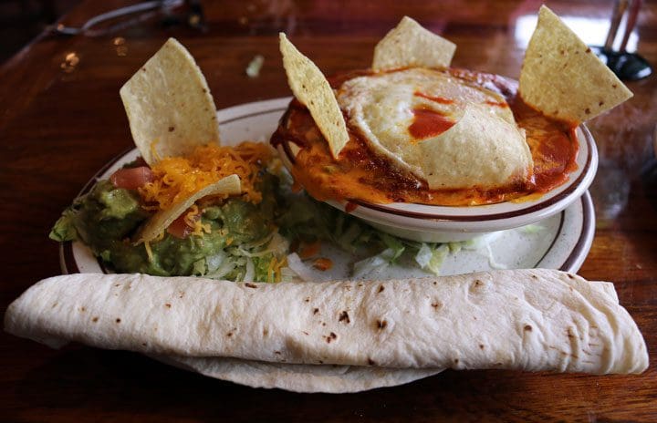 26 February 2017: Traditionalists who love their carne adovada red can have that, too. One of the best ways is in Papa Felipe’s Chilaquile Casserole, a brimming bowlful of joy (think Beethoven’s Fifth at every bite). This entree is layer upon layer of luscious carne adovada (red), melted yellow Cheddar cheese, spicy green peppers, sweet corn, and tostadas smothered in red chile. The casserole is baked to perfection then topped with even more cheese, chile and garnish. This entree includes a flour tortilla and a side of guacamole (among the very best in New Mexico). Only with a fried egg can this dish be improved upon.