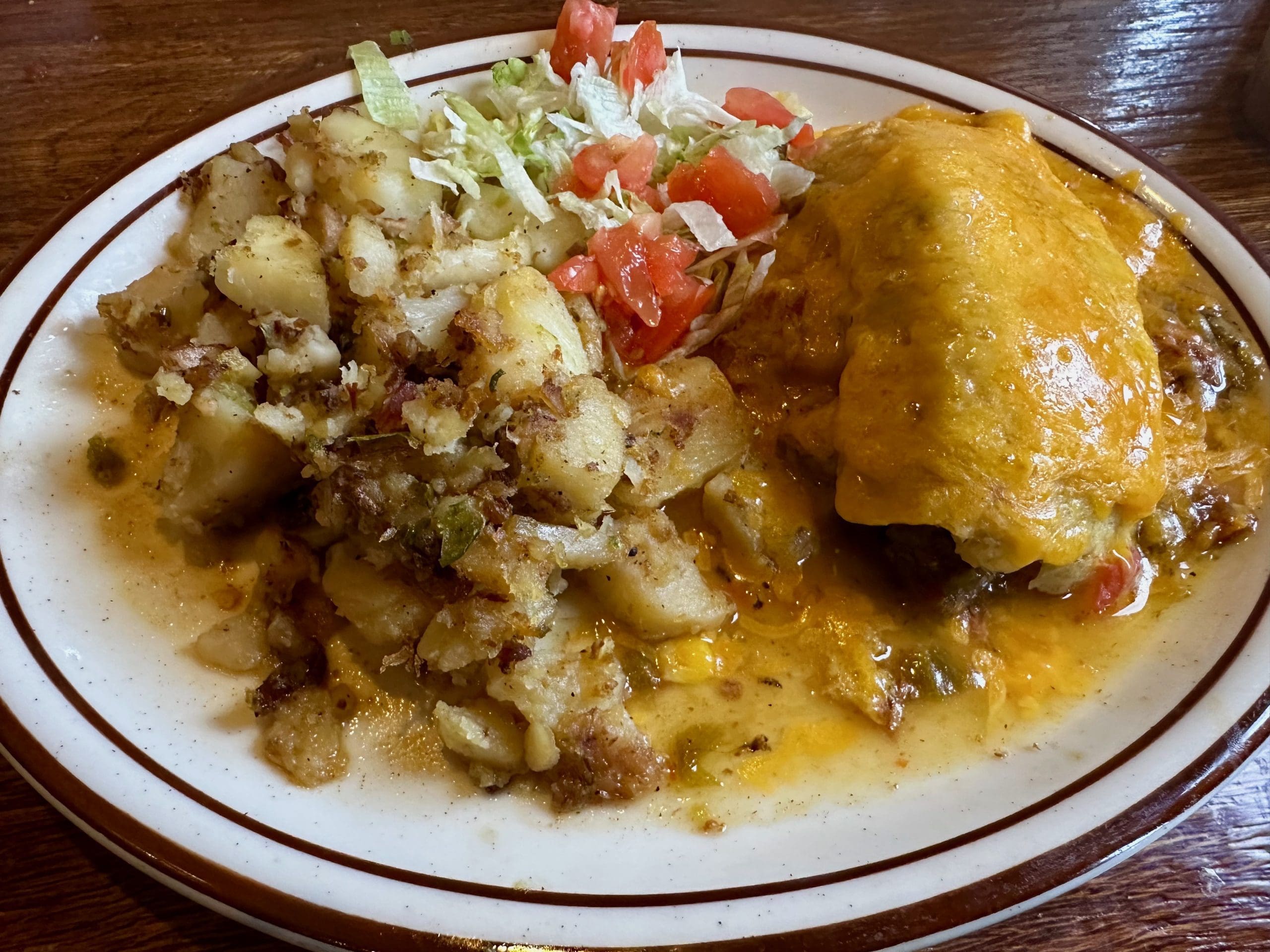 Had a combo plate (chicken enchilada w/red, taco, relleno w/green) with refritos (refried beans) and mexican corn. Chile was good. Would have to say the green was better than the red. The relleno was very tasty. The enchilada was OK. The taco was absolutely very enjoyable. It had the beef/potato mixture, and I love that! The sides were OK. The sopapilla was OK as well. I’ve had better, but I’ve certainly had worse as well.