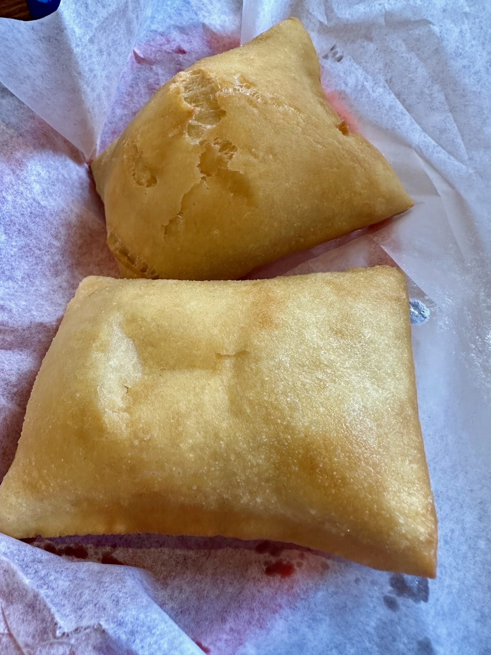 I ordered Green chile carne adovada in the form of a stuffed sopapillia with sides of refried beans and corn chowder. I loved all but the chowder-the starchy corn simply did not appeal to my childhood corn belt tastes.
