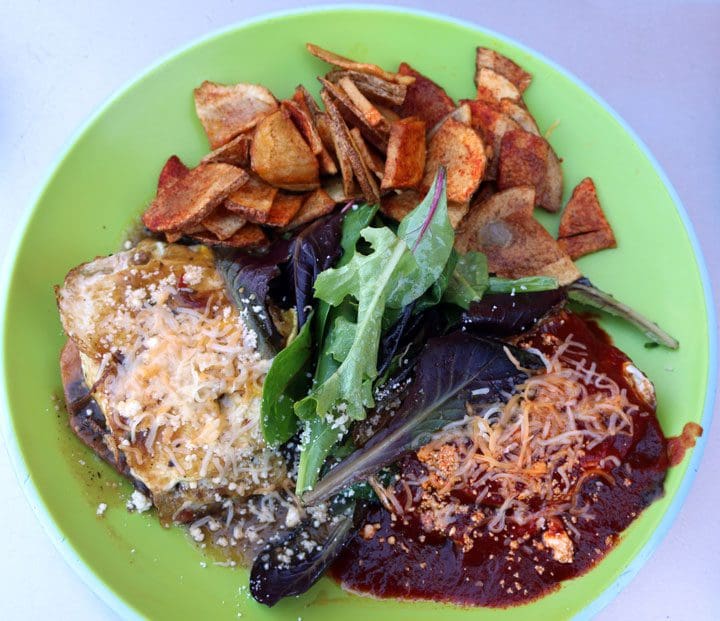 1 May 2018: While every dish Dennis prepares is a paragon of creativity and deliciousness, perhaps the dish which best shows off his versatility is vegetable curry with papaya salad, a special of the day during our inaugural visit. If you thought his repertoire was limited to New Mexico inspired Mexican food, this dish will convince you otherwise. It’s curry as well-prepared as the curry at the very best Thai restaurants in Albuquerque. Dennis has mastered the delicate balance of flavors–pungent, sweet, savory–characteristic of Thai food, not compromising the integrity of flavors to pander to American preferences for cloying Thai dishes. The vegetables are perfectly prepared, somewhere between al dente and fork-tender. In a masterstroke of genius, Dennis tops the vegetable curry with a tangy papaya salad, again as good as you’ll find at any Asian restaurant in town.