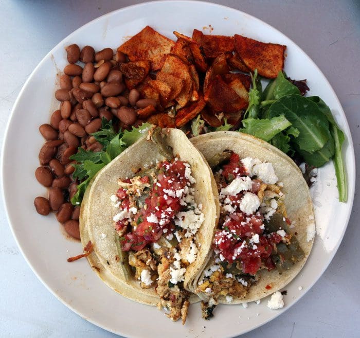 BEST BET: Grilled Cheese with Mango, Chicken Chicharrones, Black Bean Stew, Vegetable Curry with Papaya Salad, Elote, Huevos Divorciados, Lemon Ricotta Pancakes, Roasted Organic Chicken Achiote Tostada, Nopaies Tacos, Carnitas Quesadilla, Chips and Salsa