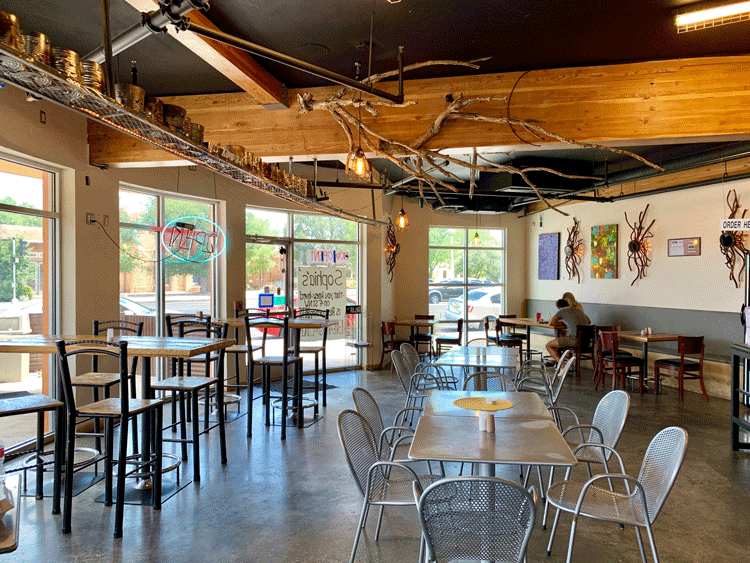 Ensconced on the southwest corner space on the first floor of the capacious Silver Moon Lodge apartment building along historic Route 66, Sophia’s reborn is the antithesis of its namesake predecessor. Where the Sophia’s on 4th Street was situated in a homey ramshackle old structure and for a time didn’t even have signage to tell you you’d arrived, the new Sophia’s has a more contemporary feel to it. Parking at the new venue on the fringes of both downtown and Old Town is a bit tricky, but at least you’ll be parking on pavement. The parking lot at the old Sophia’s was prone to muddiness during inclement weather.