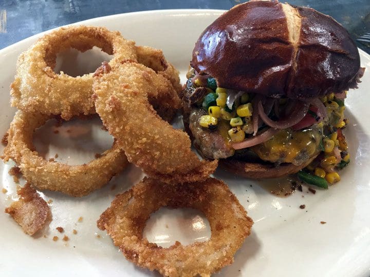 30 May 2018: “Soothing the soul” can mean different things to different people. For me, it often means a gourmet burger, preferably one unique in its creative composition. Dave’s offers the Brat Burger (a blend of ground chuck and bratwurst, fire-roasted corn relish, pickled red onions, stout beef aioli and Cheddar on a pretzel bun). This is a messy (four napkins at least) burger…in a good way. The most surprising ingredient is the fire-roasted corn relish whose smoky sweetness contrasts nicely with the stout beef aioli. Fortunately the pretzel bun is up for the job of holding all ingredients in place so you don’t have to wear them on your shirt. You’ll still lose some on the plate, but that’s what forks are for. The ground chuck and bratwurst blend is terrific, a melding of complementary proteins that seemed to bring out the best in one another. You’ll want to pay the up-charge for the onion rings. They’re some of the best in town.