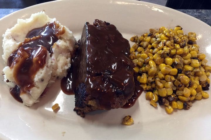 30 May 2018: For my friend Bill Resnik, “soothing the soul” means ordering comfort food, something that reminds him of family meals. Perhaps the meal most often associated with comfort food is meatloaf. Granny’s meatloaf, described on the menu as “old-fashioned meatloaf and brown gravy” was his choice with fire-roasted corn and onion rings as his sides. The meatloaf was slightly overdone—at least on the outside—but the interior was moist and delicious. Both the mashed potatoes and meatloaf were smothered in dark brown gravy. Bill enjoyed the fire-roasted corn most of all.