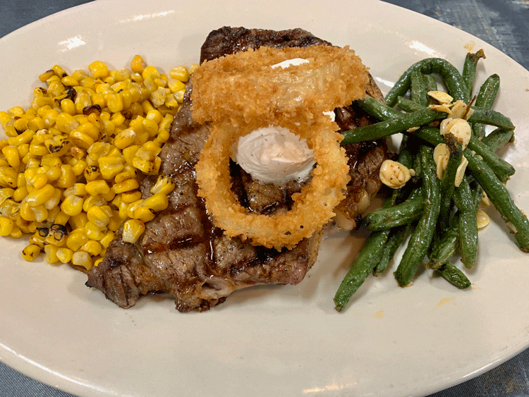 1 October 2019: You would certainly expect to pay premium prices for a charbroiled USDA choice certified Black Angus ribeye topped with blue cheese butter and onion rings served with two sides. At Dave’s, you’ll pay about half of what you might expect. As of this writing, all of this is yours for under a double-sawbuck (twenty-dollars). The choice quality ribeye is very tender, juicy and flavorful with the distinct “campfire” deliciousness imparted by a grill. Prepared to your exacting specifications, it’s ten-ounces that will sate carnivorous cravings. The only nit we could pick was with the blue cheese butter which appeared to have been extricated from a cold refrigerator. It didn’t melt onto the steak as we would have liked. My Kim’s sides were fire-roasted corn and green beans Almondine, both of which she enjoyed.