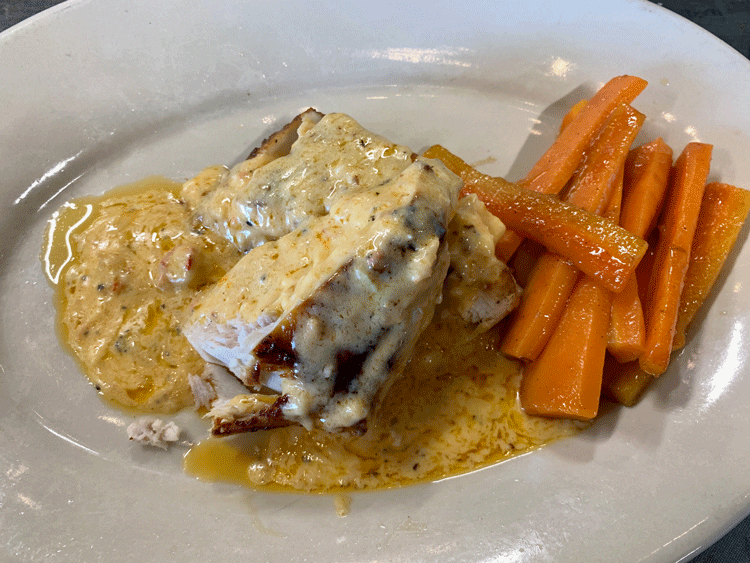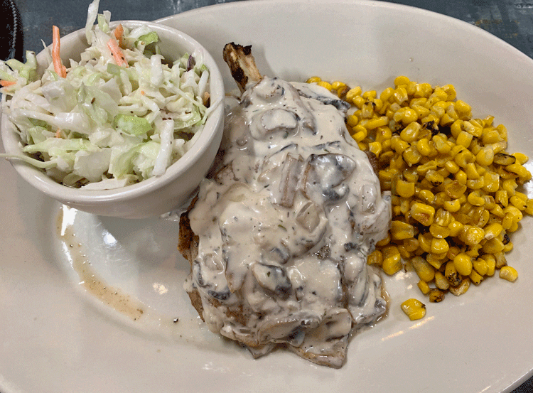 1 October 2019: Perhaps inspired by the lyrics of Jimmy Buffett’s “Cheeseburger in Paradise,” my Kim and I are trying to “amend our carnivorous habits.” That’s not easy to do when you peruse a menu offering pork chop and Irish whiskey mushroom sauce, a ten-ounce Frenched pork chop with Irish whiskey mushroom sauce and two sides. My willpower faded like attendance at UNM Lobos football games after their first loss. The brawny hunk of porcine protein is “Frenched” (when the meat is cut away from the end of a rib or chop, so that part of the bone is exposed) which means it has a built-in “handle.” You’re not likely to pick it up, however, because there’s so much rich, thick gravy with lots of gravy. This is the type of gravy you could drink up by the cupful.